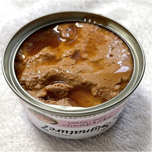 原材料  チキン、ツナ、クコの実、グリシン、ビタミンとミネラル(第三リン酸カルシウム、塩化カリウム、塩化ナトリウム、塩化コリン、硫酸マグネシウム、硫酸第一鉄、酸化亜鉛、α-トコフェロール、ナイアシン、酢酸レチノール、たんぱく質キレート銅、硫酸マンガン、チアミン硝酸塩、第二リン酸カルシウム、パントテン酸カルシウム、リボフラビン、ピリドキシン塩酸塩、ビオチン、ビタミンB12、亜セレン酸ナトリウム、コレカルシフェロール、葉酸、ヨウ化カリウム、酸化マグネシウム)、チキンレバー、グアーガム、カラメル、まぐろエキス、タウリン