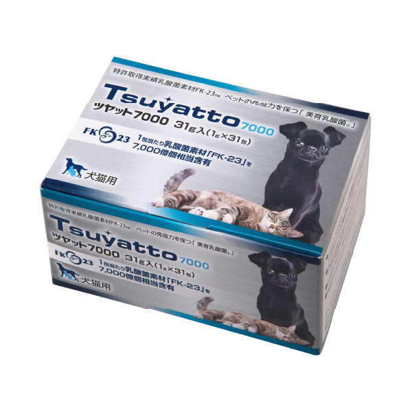 ツヤット(犬猫用)は、高度な培養技術で生産されたエンテロコッカスフェカリスFK-23(乳酸菌FK-23菌粉末)を1包当たり7,000億個相当含有する、ペットの健康維持をサポートするために開発された栄養補助食です。防腐剤・保存料・香料は使用しておりません。継続的にご使用されることをおすすめいたします。